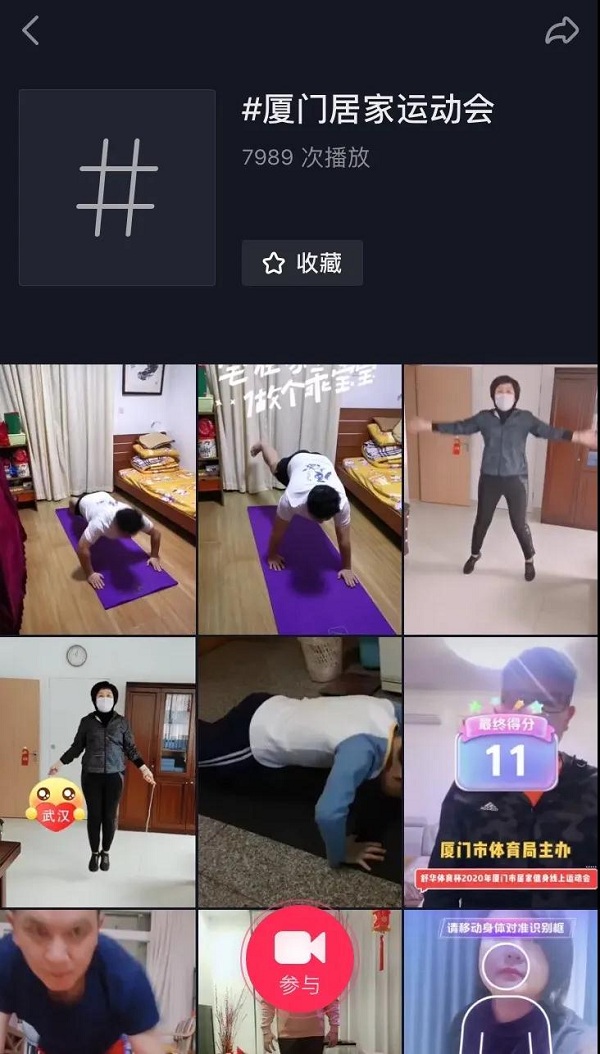 “舒华体育杯”2020年厦门市居家健身线上运动会,上线仅7天,抖音话题热度突破100万!越来越多的市民提交参赛视频,散打世界冠军王文忠也来了,活动时间截止至3月9日,赶紧报名参与吧!