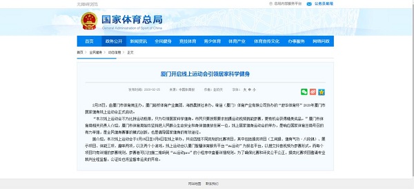 近期,厦门史上首次举办线上运动会——“舒华体育杯”2020年厦门市居家健身线上运动会火热进行中,引发新华网、中国新闻网、厦门日报、海西晨报等国内30多家新闻媒体纷纷报道,国家体育总局官网也刊发《厦门开启线上运动会引领居家科学健身》点赞厦门全民健身的创新之举。