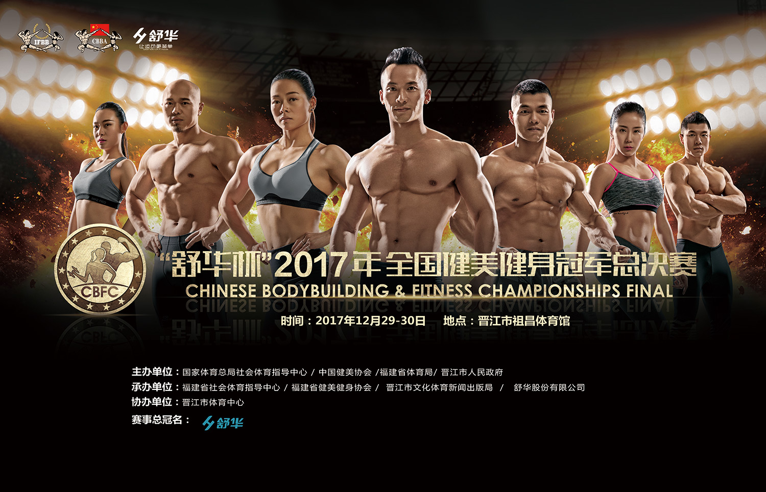 近日,中国健美协会官网正式发布《关于印发2017年全国健美健身冠军总决赛竞赛规程的通知》:由国家体育总局社会体育指导中心、中国健美协会、福建省体育局、晋江市人民政府联合主办,福建省社会体育指导中心、福建省健美健身协会、晋江市文化体育新闻出版局、舒华股份有限公司联合承办,晋江市体育中心协办的“舒华杯”2017年全国健美健身冠军总决赛(简称“冠军总决赛”),将于12月29日至30日在福建晋江举办。